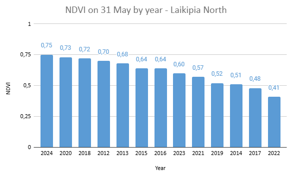 Historically, the NDVI levels on 31 May in Laikipia North ranged between 0.41 in 2022, and 0.75 in 2024, with an average NDVI value of 0.61.